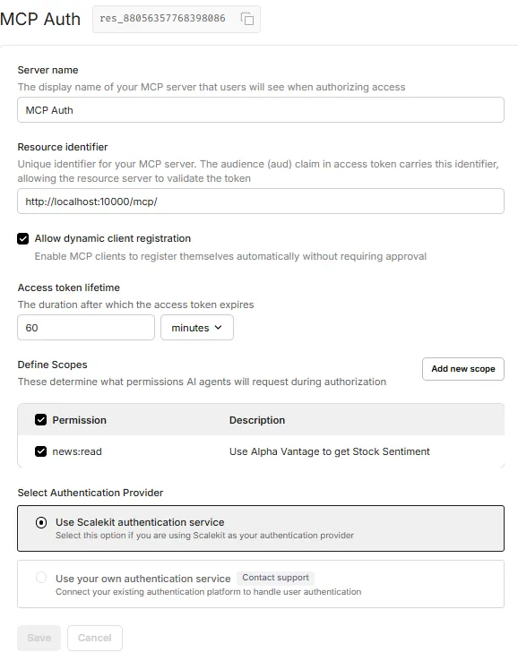 Once the server is created, Scalekit will generate your resource metadata. Be sure to note down the MCP Server Identifier (found next to the server name, e.g., res_88056357768398086), as you’ll need it later.